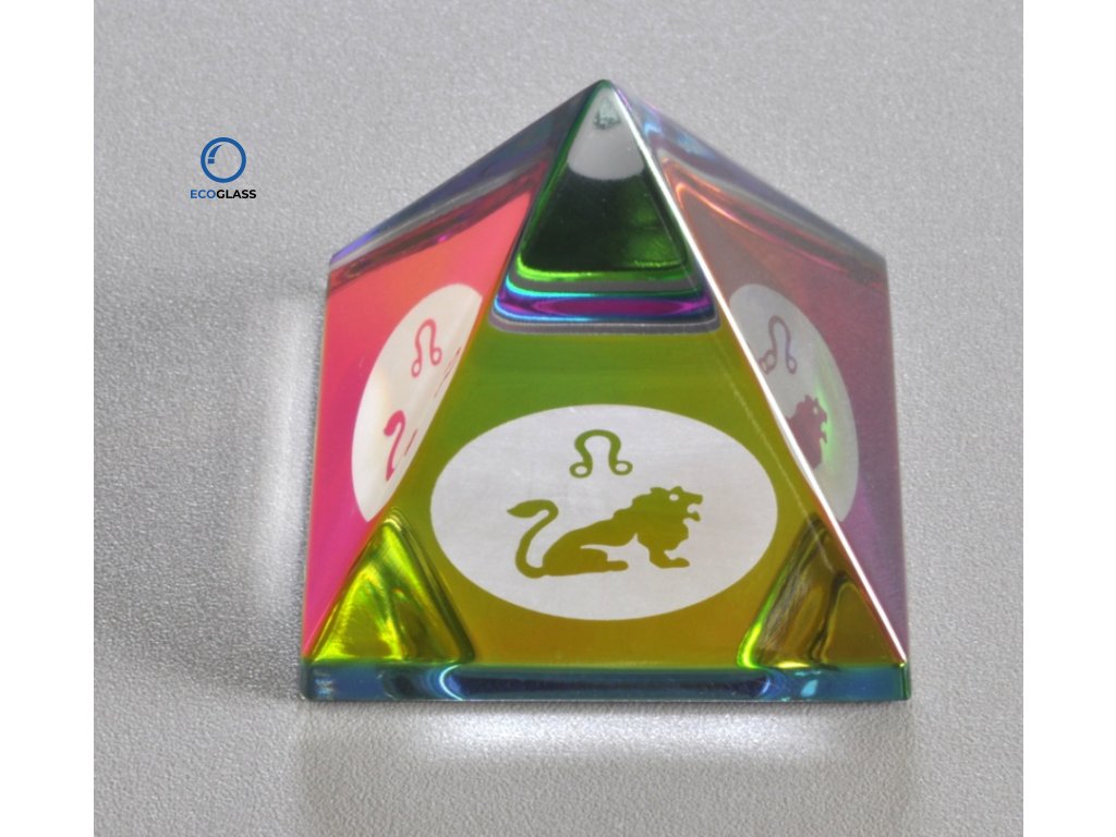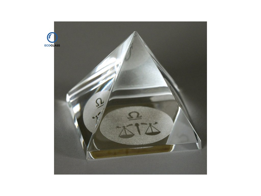 Pyramida je vyrobena z českého optického skla. Čtyři šikmé stěny jsou lisované s ohněm leštěným povrchem, spodní rovinná plocha je mechanicky broušená a leštěná. Pyramidu lze dekorovat barevným pokovem na spodní straně. Je to vhodný dárek k narozeninám.